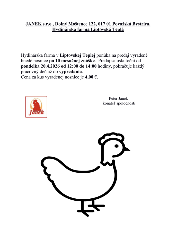 Hydinárska farma v Liptovskej Teplej ponúka na predaj vyradené hnedé nosnice po 10 mesačnej znáške. Predaj sa začne 20. apríla 2026 od 12:00 do 14:00 a bude pokračovať každý pracovný deň až do vypredania.